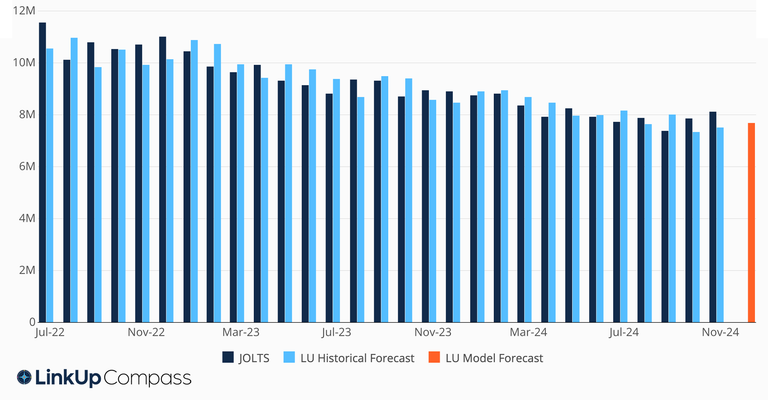 LinkUp’s JOLTS forecast for December is 7.64 million open jobs, marking a large 5.36% decrease in job openings from November to December.