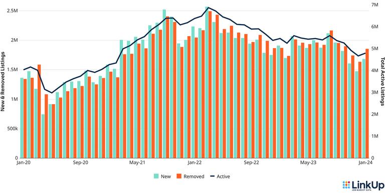 The LinkUp 10,000 showed a similar increase in January 2024. Since December last year, job listings from the top 10,000 global employers have declined by 12.6%, while last month it increased 2.5%.