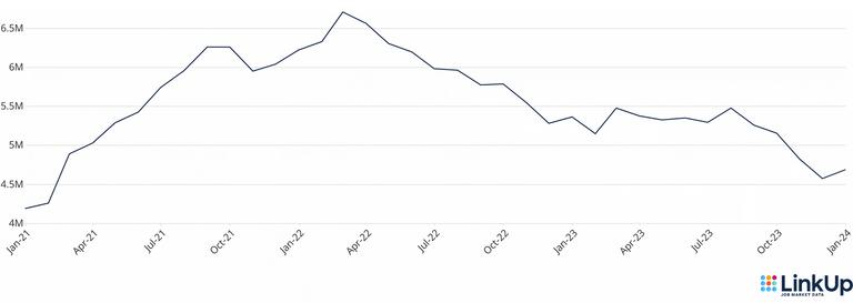 In his roundup of predictions for market trends in 2024, LinkUp CEO Toby Dayton expected a stronger and more resilient job market than consensus estimates following a labor demand slump late last year. LinkUp forecasted job growth of 195,000, outpacing consensus estimates. But even our optimistic expectations were exceeded by the staggering BLS report of 353,000 job adds in January.