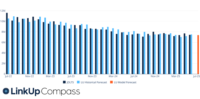 LinkUp’s JOLTS forecast for June is 7.40 million open jobs, marking a .5% decrease in job openings from June to July.
