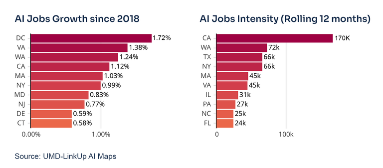 Recent analysis of the Intensity across the United States powered by UMD-LinkUp AI Maps sheds light on this phenomenon. As we reported last week, Washington DC has emerged as the #2 AI hub in the country behind California. But when it comes to AI intensity, the Capital is in a class of its own, with an impressive AI Jobs Intensity measure of 1.8%, significantly surpassing the national average of 0.6%. Following closely behind are Virginia at 1.4% and Maryland at 0.8%, underlining the increasing concentration of AI opportunities in the capital region.