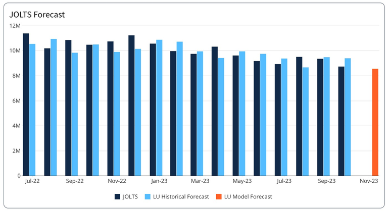 As always, our forecast comes well ahead of the official JOLTs release; the BLS will release its job opening report for November on January 3rd, 2024. Bear in mind that the BLS derives JOLTs numbers from surveys and their method has always been, to some extent, an exercise in speculation. But in the last four years, the response rate of the JOLTs survey has plummeted from roughly 60% in 2019 to a room-clearing 31% by February of this year. With data like these, who needs enemies?